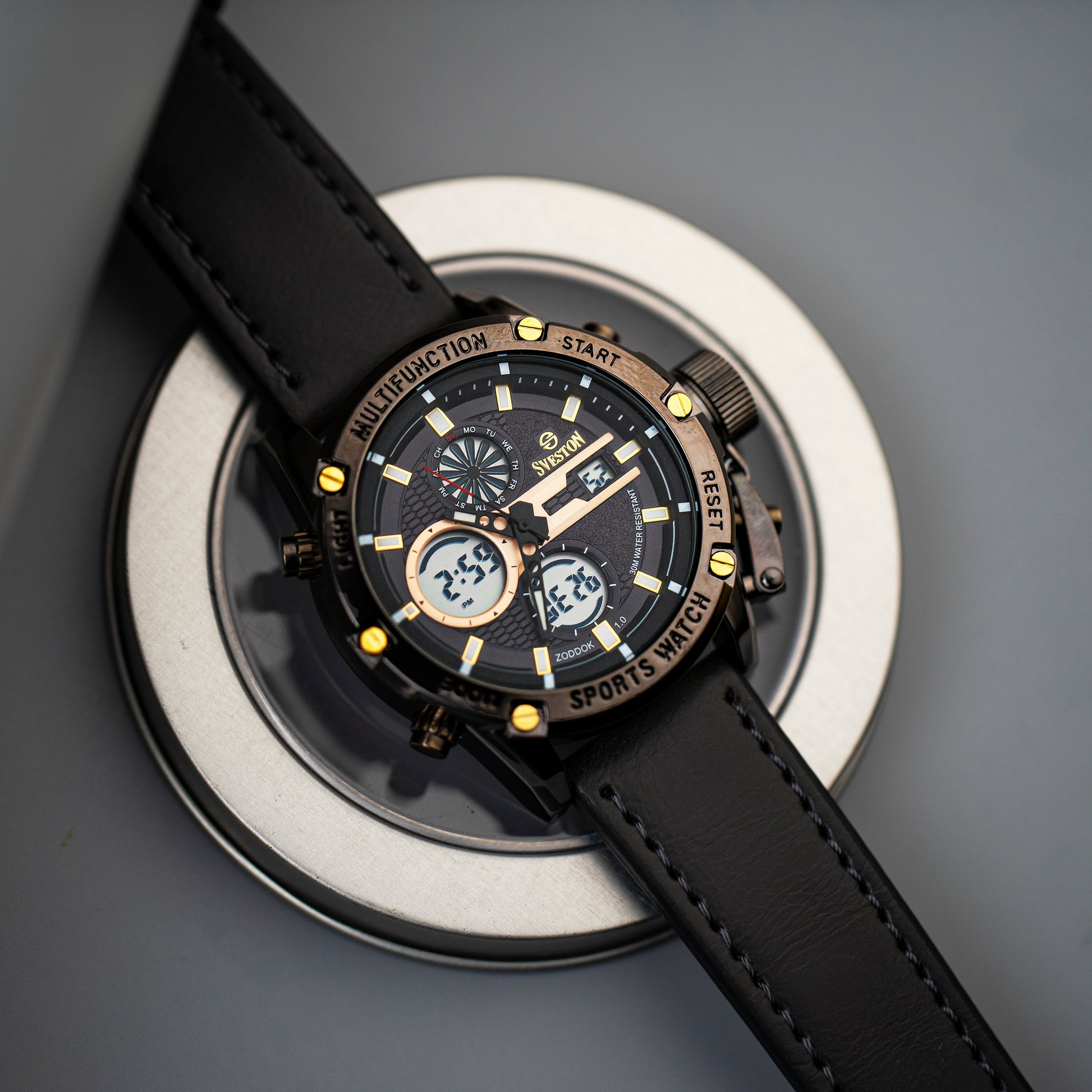 Command attention with this bold Syston multifunction sports watch, designed for men who demand performance and style in one. Featuring a premium black leather strap, dual digital–analog display, and gold-accented bezel, this timepiece blends rugged durability with modern sophistication.